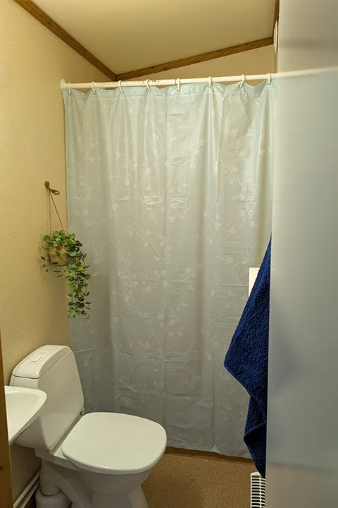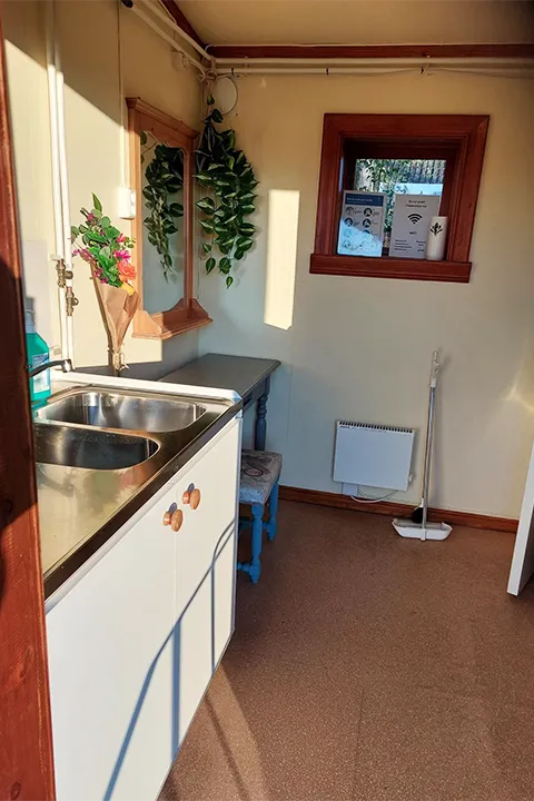 The service building is fully equipped with toilets, sinks, free showers, and a small kitchen area. In the main building, “The old school,” you’ll also find a laundry room, a larger kitchen, and a sauna, perfect for relaxing after a day outdoors.